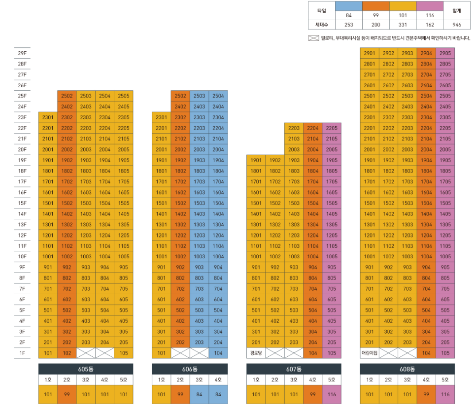 이 아파트는 19~29층에 8개동으로 총 946가구로 이루어져 있으며, 모든 세대가 분양으로 제공됩니다.
