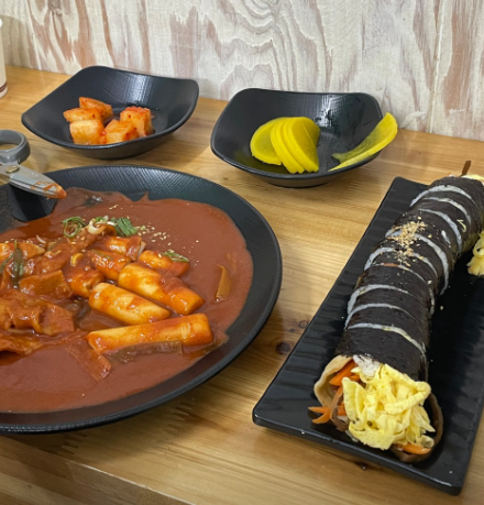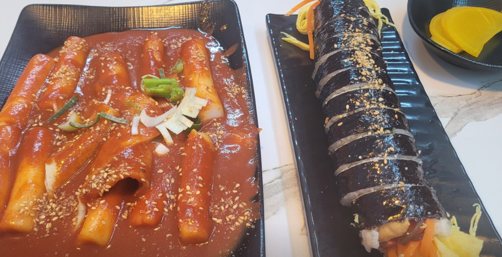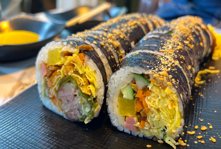 또 다른 인기 김밥 메뉴로 "고추튀김 김밥"을 즐길 수 있습니다. 이 김밥은 김밥과 고추튀김을 한 번에 즐길 수 있는 특별한 조합입니다. 고추튀김에는 소고기와 돼지고기를 넣고, 당면, 당근, 양파와 함께 속을 만들어요. 이 특별한 튀김은 두 번 튀겨 바삭함을 극대화시킵니다. 김밥과 함께 제공되는 해산물 육수로 만든 잔치국수를 먹으면, 이보다 더 좋을 수 없는 완벽한 한 끼 식사가 완성됩니다.