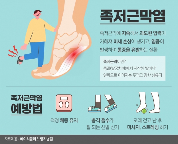 이 질환은 발밑의 족저근막에 염증이 생겨 발뒤꿈치에서 발가락까지 이어지는 섬유띠가 영향을 받는 질환으로, 중장년층 뿐만 아니라 젊은 세대에게도 흔하게 발생합니다.